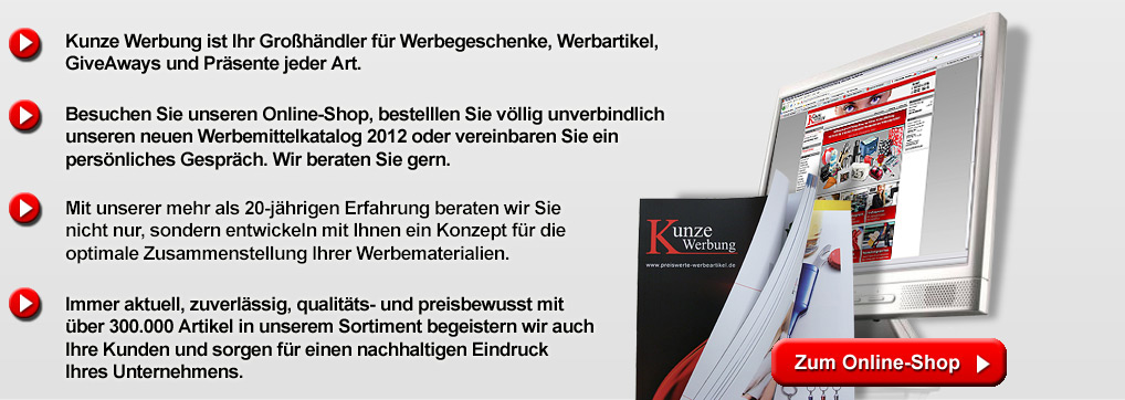 Ihre Werbung muss vielfältig transportiert werden, um ihr Unternehmen zu repräsen- tieren. Sie funktioniert erst dann, wenn sie vom Empfänger als sympathisch empfun- den wird. Werbekugelschreiber sind hierbei ein effizientes und beliebtes Werbe- Medium mit einer deutlich höheren Wirkung als manch andere Werbeartikel.